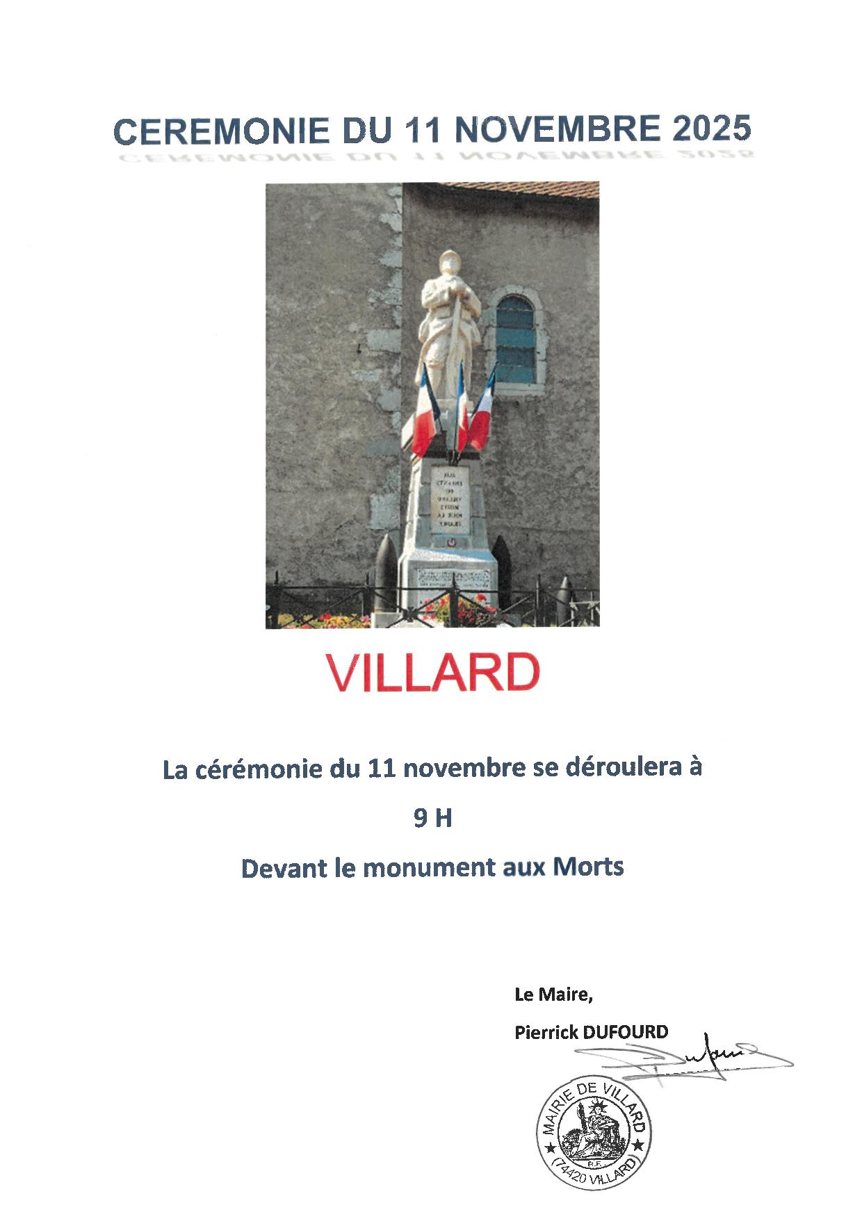 Cérémonie de commémoration du 11 novembre à 9H au Monument aux Morts de Villard