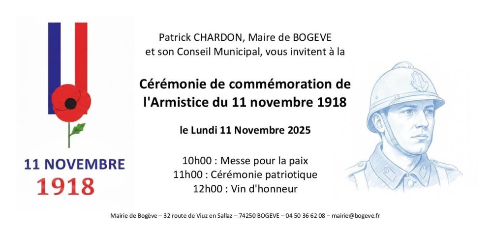 La cérémonie du 11 novembre 2025 se déroulera à Bogève (et non Habère-Lullin comme indiqué sur le Villard Infos n°10 en raison de l'église fermée pour travaux) pour l'ensemble des communes de la vallée verte